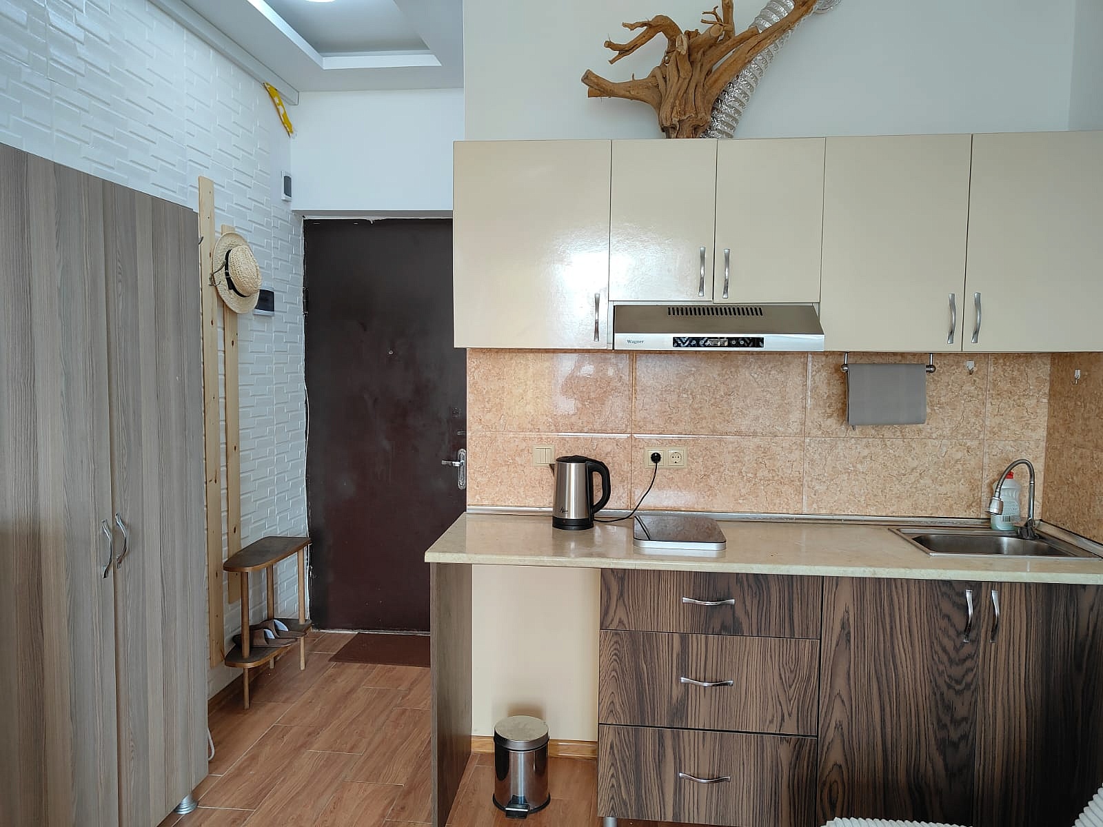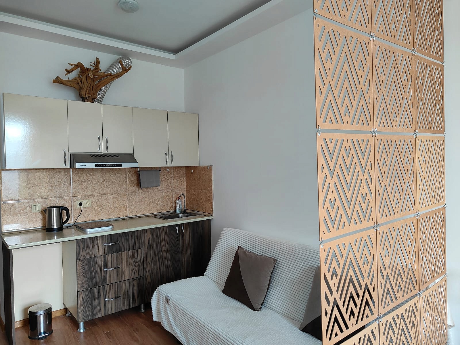 Небольшая, но функциональная студия с продуманным пространством и окнами на юг. Здесь есть всё, что нужно: кухонная зона с техникой, место для отдыха/сна и ванная комната.